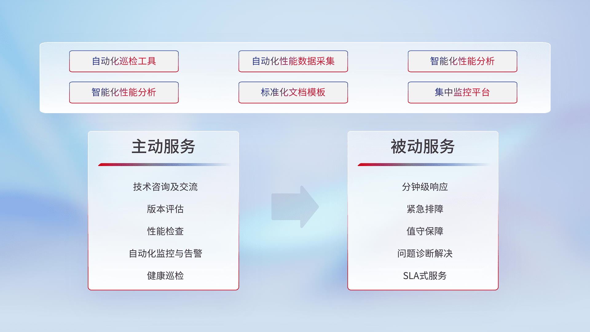 智能化工具和标准化文档,,,保障服务质量,,,,提供主动服务(包含技术咨询、、版本评估、、、性能检查、、、自动化监控与告警、、健康巡检)和被动服务包含(分钟级响应、、、紧急排障、、值守保障、、问题诊断解决、、SLA服务)。。。。