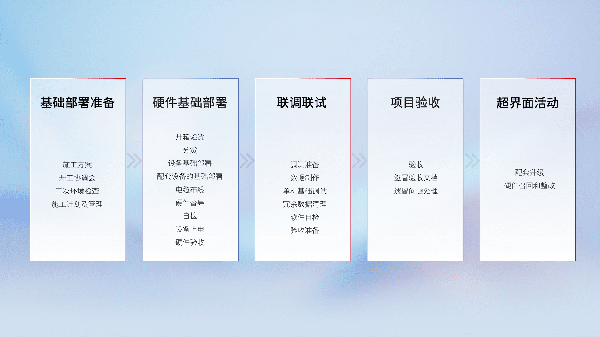 从基础部署准备、、、、硬件基础部署、、联调联试、、、、项目验收、、、越界面活动的全过程可追溯,,,保证施工质量和进度。。